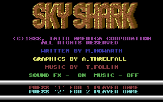 Flying shark known as Sky Shark in the US was originally a coin-op machine developed by Taito, we used the arcade machine as a reference for the commodore 64 version of Sky Shark.